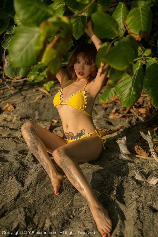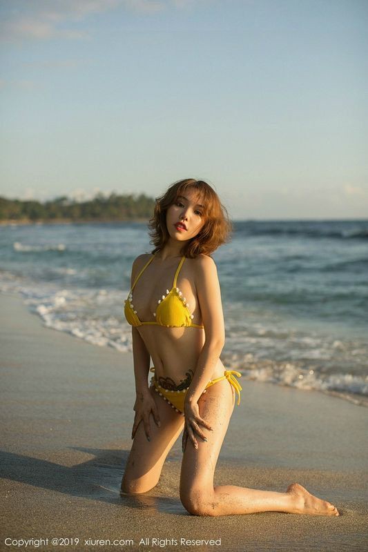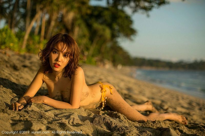 女神黄乐然户外沙滩金色比基尼半脱露豪乳摄人诱惑写真